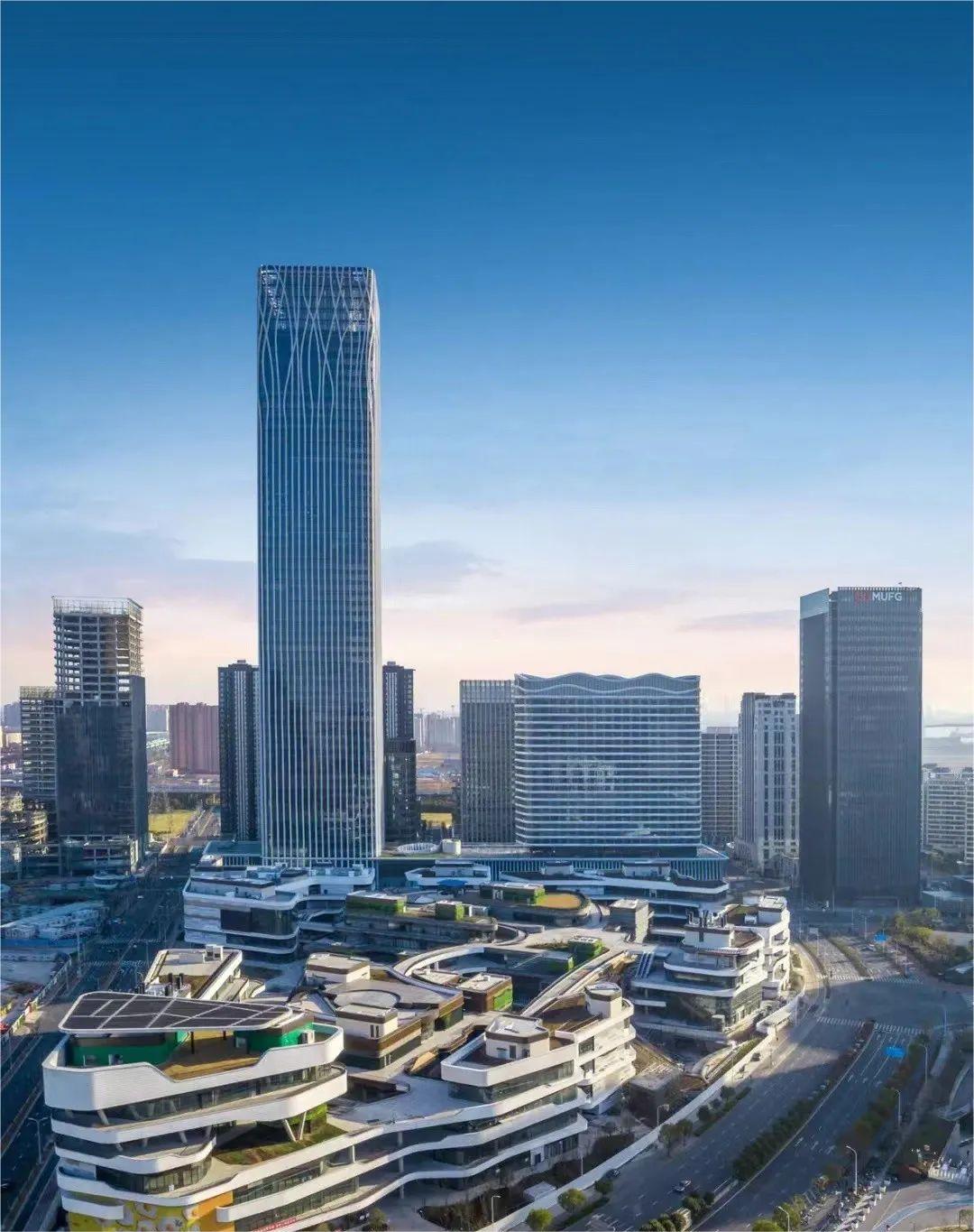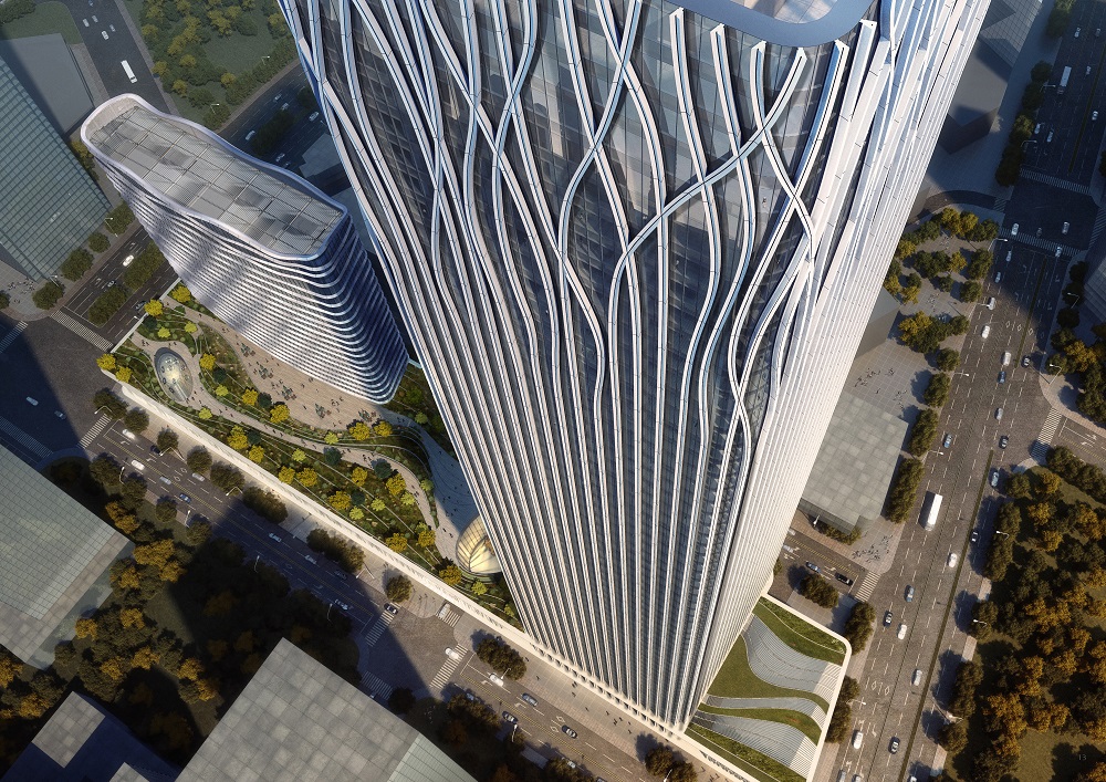 設(shè)計(jì)大師“樹”的設(shè)計(jì)理念突出體現(xiàn)在外立面幕墻。鋁幕線條從6層開始齊頭并進(jìn)直至215米處,之后線條開始不規(guī)則地“開枝散葉”,使得前灘中心看起來(lái)更為靈動(dòng)、生機(jī)勃勃。